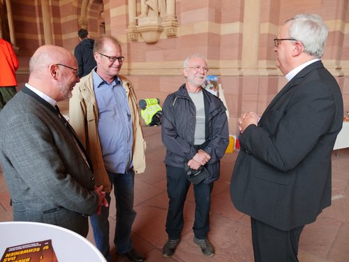 Speyer. Zu einem Austausch zum Thema sexueller Missbrauch durch Kleriker, Ordensangehörige oder andere Mitarbeiterinnen und Mitarbeiter im kirchlichen Dienst hatte der Betroffenenbeirat im Bistum Speyer am Donnerstagnachmittag an einem Stand in der Vorhalle des Domes zu Speyer eingeladen. Bernd Held, Vorsitzender des Betroffenenbeirates im Bistum und sein Team informierten über Hilfsmöglichkeiten für Betroffene und den aktuellen Stand bei der Aufarbeitung. Ein besonderer Gast war Rudi Schreiber, der in Birkenheide gestartet ist und in 55 Tagen nach Rom wandern will, um dem Thema Missbrauch mehr Öffentlichkeit zu verschaffen. Bischof Dr. Karl-Heinz Wiesemann und Generalvikar Markus Magin beteiligten sich an dem öffentlichen Austausch. Das Rechtsamt des Bischöflichen Ordinariates unterstützte die Veranstaltung organisatorisch und mit Bewirtung.