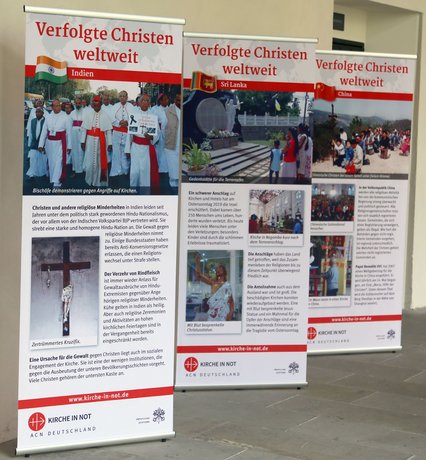 Die Ausstellung „Verfolgte Christen weltweit“ zeigt in kurzen Texten und beeindruckenden Bildern, wo die Christenverfolgung besonders groß ist. Sie stellt aber auch vor, wie Christen trotzdem treu zum Glauben stehen und das kirchliche Leben in den jeweiligen Ländern blüht. Insgesamt besteht die Ausstellung aus 15 bedruckten Bannern mit einer Einleitung und 14 kurzen Länderporträts.