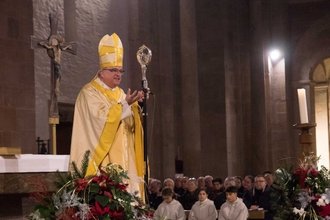 Speyer. "Wir bitten um ein gesegnetes neues Jahr – wir wissen nicht, was kommt", sagte Bischof Dr. Karl-Heinz Wiesemann bei seiner Begrüßung zum Pontifikalamt zum Jahresschluss. Im vollbesetzten Dom zu Speyer verabschiedeten die Gläubigen am Silvester-Nachmittag gemeinsam mit dem Bischof das alte Jahr und baten um Gottes Beistand für das neue. In Zeiten politischer Umbrüche und einer ungewissen Zukunft spendete der Bischof Zuversicht. Er forderte die Menschen auf, sich nicht vermeintlich vorbestimmten Situationen zu fügen, sondern mit Gottvertrauen die Zukunft selbst in die Hand zu nehmen.