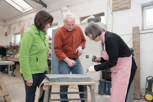 Freilich gehörten Gedenken und Gespräche am Samstag dazu, sie leiteten den besonderen Tag in Harthausen (Rhein-Pfalz-Kreis) ein. Sieben Frauen waren in die Werkstatt von Steinmetzmeister und Bildhauer Siegfried Keller gekommen. Teilweise hatten sie lange Wege zurückgelegt, etwa aus der Südwestpfalz oder aus Baden-Baden. Einige haben einen geliebten Menschen erst vor kurzem verloren und sind während der Steinmetzarbeiten innerlich aufgewühlt. Andere haben den Verlust schon vor einigen Jahren erlitten, aber ihre Trauer ist noch immer gegenwärtig. Die sieben Frauenhaben den Ehepartner, die Eltern, Großeltern oder das eigene Kind verloren. Mit Muskelkraft und Steinmetz-Technik und in Gedenken an ihre Angehörigen formen sie aus einem Quader einen Wassertropfen oder zeichnen eine Eule auf die Oberfläche. Sie schaffen Reliefs, etwa eine Berglandschaft oder mit dem Yin-Yang-Zeichen. Teilnehmerin Veronika Steuermann dies gut gefallen, als Steinmetz Keller zu Beginn des Tages über Symbole und ihre Bedeutung sprach. In den beiden Gegensätzen, die sich einander bedingen und eine Einheit schaffen, sieht die Vorderpfälzerin etwas Wegweisendes: "Man muss immer im Gleichgewicht bleiben."