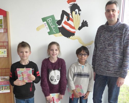 Die stolzen Gewinner des Preises: Nicklas (Klasse 2), Milena (Klasse 4) und Leon (Klasse 3) mit Büchereileiter Ulf Weber.