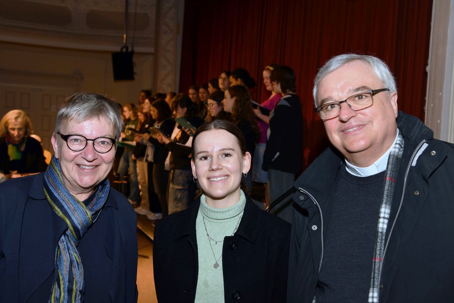 Die Autorin des Berichts Mia Alana Melber mit Bischof Karl-Heinz Wiesemann und Kirchenpräsidentin Dorothee Wüst.