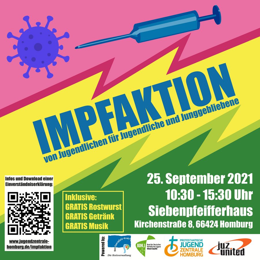 Die Impfaktion findet statt am 25.09.21 von 10:30h-15:30h im Siebenpfeifferhaus, Kirchenstraße 8, 66424 Homburg. Es ist kein Termin nötig, einfach vorbei schauen! Für alle die kommen gibt es die Impfung, etwas zu essen und zu trinken, Spiele und chillige Musik. Bis 16 Jahre ist für die Impfung eine Einverständniserklärung der Eltern nötig, die man unter „jugendzentrale-homburg.de/impfaktion“ herunterladen kann. Eltern und andere Erwachsene können sich auch beim Aktionstag impfen lassen.