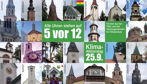 Auch die pfälzischen und saarpfälzischen Gruppen von „Fridays for Future“ fordern beim weltweiten Klima-Aktionstag am 25. September 2020 zum Engagement und Mitmachen auf. Mit einem Foto ihrer Turmuhren, die auf „5 vor 12“ stehen, fordern 17 Kirchen aus der Pfalz und ihren Partnergemeinden ein sofortiges Umdenken und Handeln mit der Botschaft „Die Zeit läuft ab!“.