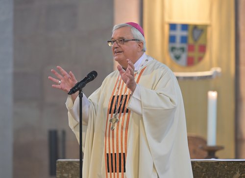 „Was für ein Bild haben Sie persönlich von der Zukunft der Menschheit und unserer Welt, von ihrer ganz persönlichen Zukunft? “ Diese Frage stellte Bischof Dr. Karl-Heinz Wiesemann an den Beginn seiner Predigt. Er selbst ertappe sich in letzter Zeit immer häufiger dabei, dass angesichts der vielen Krisen dieser Welt sich düstere Töne in sein Zukunftsbild mischten. Bei ihm selbst, wie bei vielen Menschen, sei das Vertrauen in handelnde Personen, beispielsweise bei der Konferenz in Alaska, gering und der Glaube schwinde, dass die globale Weltgemeinschaft Herausforderungen wie dem Klimawandel gemeinsam begegnen könne. In dem Erstarken rechter Bewegungen sehe er eine Rückorientierung auf die eigene Nation oder eigene Lobby.