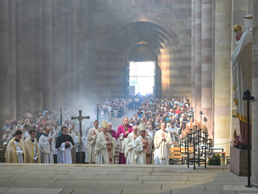 Speyer. Angenehme 24 Grad hatte es im Innern des Domes, als am 15. August das Hochfest Mariä Himmelfahrt gefeiert wurde. Viele Menschen waren gekommen, darunter auch eine große Pilgergruppe, die das Patronatsfest des Speyerer Doms und des Bistums Speyer mitfeierten. Das von Bischof Dr. Karl-Heinz Wiesemann zelebrierte Pontifikalamt wurde live auf den Social-Media-Kanälen von Dom und Bistum übertragen, wo es auch im Nachgang angeschaut werden kann (https://www.youtube.com/watch?v=WkCZYY7Vaq0). Thematisch stellte Bischof Wiesemann den Gottesdienst unter das Motto „Pilger der Hoffnung“ und zeigte auf, wie das Bild der „mit Leib und Seele in den Himmel aufgenommenen Gottesmutter Maria“ allen Gläubigen ein Hoffnungszeichen sein könne. „Mit Maria dürfen wir das schauen, was uns im Glauben geschenkt wird“, sagte Bischof Wiesemann in seiner Begrüßung. Einen besonderen Gruß entbot er den Pilgern, die in einer nächtlichen Wallfahrt zum Dom gekommen waren sowie den mitfeiernden Gehörlosen, für die der Gottesdienst in Gebärdensprache gedolmetscht wurde.