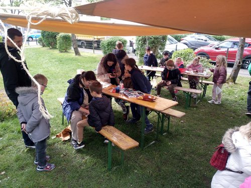 Auch einige Erwachsene waren begeistert mit oder auch ohne Kinder bei den Aktivitäten dabei. Die meisten nutzten das Fest zum Erzählen, untereinander und mit den Pfadfindern. Am Verpflegungsstand gab es kostenlose Muffins, herzhaftes Gebäck, belegte Brötchen und Getränke. Die wenigen übriggebliebenen Lebensmittel blieben im Stadtteilbüro zur Weitergabe an Bedürftige. Zwischendurch und kurz vor dem Ende des Festes um 15 Uhr haben sich auch die Jurte und Dächer aus Zeltplanen bewährt, die zum Schutz vor dem prognostizierten Regen aufgebaut waren.