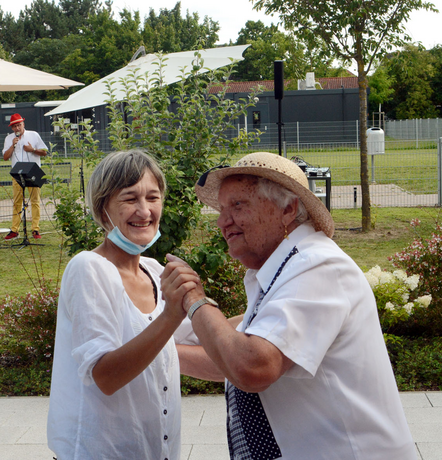 Im Schatten auf der Terrasse sitzend hat die 86-jährige Helga Laux die Titel mitgesungen: „So schön kann doch kein Mann sein“ geht ihr locker von den Lippen. Ein Leben lang habe sie in Weisenheim am Sand im Chor gesungen, erzählt sie in einer kleinen Pause der Band. „Ich kenne alle Texte“, freute sich Helga Laux. Und schon stimmte sie wieder ein bei „Lili Marleen“ und „Rote Lippen soll man küssen“.