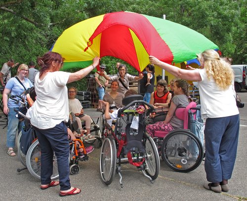 Auf dem Festplatz, wo die Musiker der Band „The Synergy“ mit flotten Rhythmen unterhalten, reiht sich eine Vorführung an die nächste. Viel Applaus bekommt die Rollstuhltanzgruppe der Förderschule, die einmal in der Woche trainiert, wie Moderator Alexander Hahn informiert. Flott schwenken die Rollstuhltänzerinnen bunte Tücher zu Nenas Hit „Leuchtturm“. „Mit großer Freude sind die mehrfach schwerstbehinderten Menschen beim Tanz dabei“, sagt Ute Golbeck, die die Gruppe seit vier Jahren leitet und mit ihr auch schulinterne Feiern gestaltet. „Sie lieben fetzige Musik, aber auch ruhige Klänge“. Später begeistern hier noch eine Einrad-Gruppe mit Jonglage und der Auftritt der Billigheimer Trachtengruppe die Besucher, bevor die Gruppe „Frau Walter“ die musikalische Unterhaltung übernimmt.