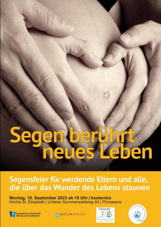 Werdende Mütter, Paare und alle, die über das Wunder des Lebens staunen, sind am Montag, den 18. September um 18 Uhr in die Kirche St. Elisabeth, Unterer Sommerwald 44 in Pirmasens, zu einer Segensfeier eingeladen. Gerne dürfen auch die werdenden Großeltern oder auch zukünftige ältere Geschwister als Begleiter mitkommen. Dabei spielt es keine Rolle ob die Menschen kirchlich gebunden sind oder nicht, alle sind herzlich willkommen.