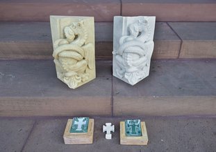 Abgüsse der Bauzier am Westbau des Speyerer Doms. Der weiße Abguss besteht aus Gips, der gelbe aus einer Steinersatzmasse, welche das Original imitiert. Das Kreuz im Vordergrund dient zur Illustrierung der Abformungs- und Abgussmethode mittels einer Silikonform