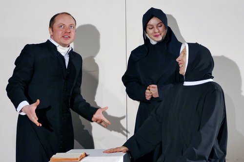 Die Frauen jener Zeit wurden von der Gesellschaft größtenteils an den Rand gedrängt. Aber in „Wer die Wahrheit tut“ sind sie es, die mehr als einmal dafür sorgen, dass sich die Dinge im Bistum positiv entwickeln. Die Figur der Katharina (Hanna Gandor) macht dabei sogar eine außergewöhnliche Entwicklung durch. Zunächst hat sie als vorlautes junges Mädchen aus dem Volk und als ledige Mutter scheinbar keinerlei Perspektive auf ein glückliches Leben. Doch dann führen die Umstände ihrer Zeit sie ins Kloster, wo sie sich mit viel Intelligenz und Fleiß Bildung aneignet und schließlich eine beliebte und angesehene Nonne wird. Insgesamt entfaltet sich ein buntes Panoptikum von Figuren, die in einem sinnenfreudigen Bühnenbild (Franziska Smolarek) die Vergangenheit zum Leben erwecken. Die Inszenierung von Regisseur Jürgen Flügge stellt gleichzeitig sicher, dass auch der im Heute lebende Zuschauer die Bezüge zu den aktuellen gesellschaftlichen Konflikten im historischen Stoff stets vor Augen hat.