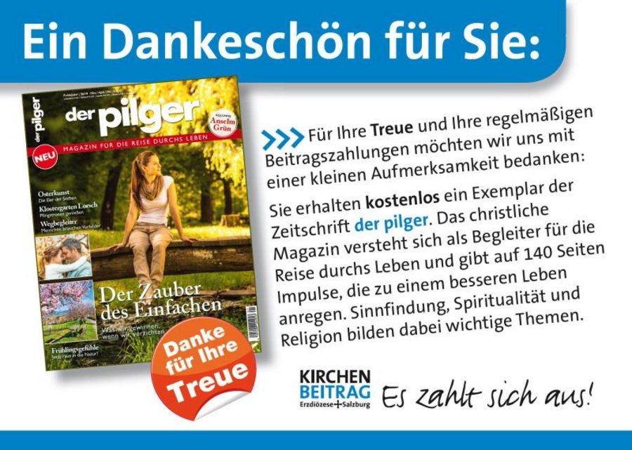 Als Dank für ihre Treue erhalten Kirchenbeitragszahler in der Erzdiözese Salzburg jetzt ein inspirierendes Geschenk: Sie können kostenlos und ohne weitere Verpflichtungen eine Ausgabe des Magazins „der pilger“ anfordern.