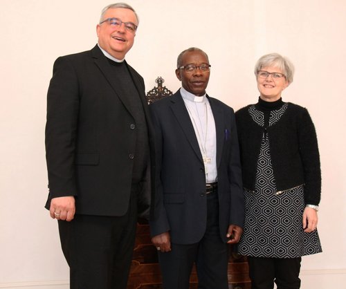 Bischof Dr. Karl-Heinz Wiesemann (links) begrüßte Bischof Jean Damascène Bimenyimana, der von Dorothea Fuchs, der Vorsitzenden des Pfarreirates der Pfarrei Hl. Martin, Kaiserslautern und Vorsitzenden des Partnerschaftsvereins der Gemeinde St. Martin, begleitet wurde