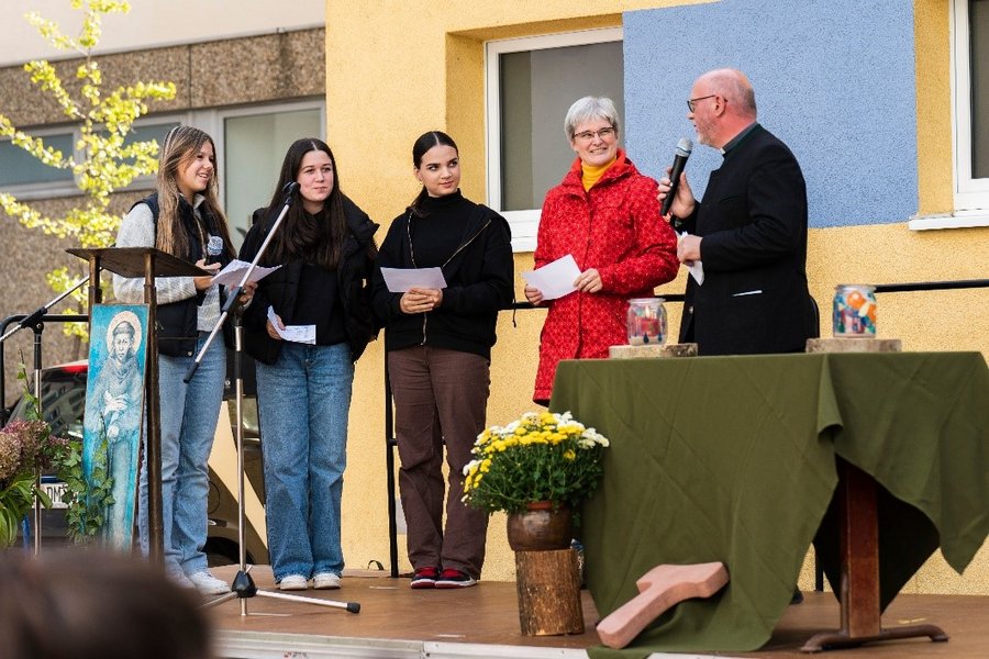 Eine anschließende große Abschlussveranstaltung im Schulhof bei schönstem Herbstwetter mit Franziskusliedern, Darbietungen von Klassen, einem Interviewgespräch mit dem Generalvikar sowie mit Gebet und Segen – umrahmt von der Schulband und Stufenchören waren schließlich der Höhepunkt dieses für die Schule besonderen Festtages.