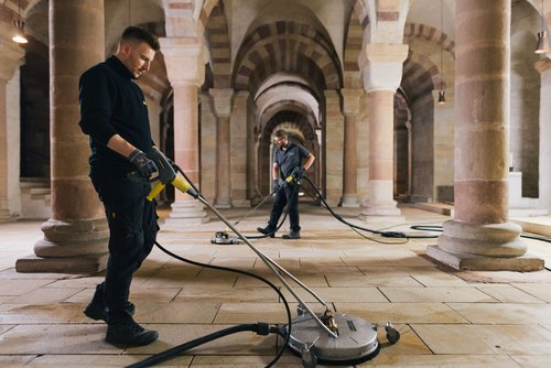 Auf den 600 m² Sandsteinboden in der Krypta lösen die Kärcher Experten mit einem Heißwasser-Hochdruckreiniger in Verbindung mit einem Flächenreiniger mit 80 °C heißem Wasser und lediglich 1–2 Bar Oberflächendruck den Schmutz aus den Poren heraus.