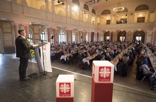 Im Anschluss an die Eucharistiefeier versammelten sich die Gäste in der benachbarten Fruchthalle. Der Caritasvorsitzende Karl-Ludwig Hundemer begrüßte die 480 ehrenamtlichen MitarbeiterInnen aus allen Teilen des Bistums und dankte ihnen für ihr Engagement. Der Leiter des Caritas-Zentrums, Hans-Joachim Schulz, der mit seinem Team die Veranstaltung organisiert hatte, erklärte, dass das Geschenk, das auf jedem Platz lag, an die Kampagne „Keys of hope“ (Schlüssel der Hoffnung) von Caritas International erinnern soll.
