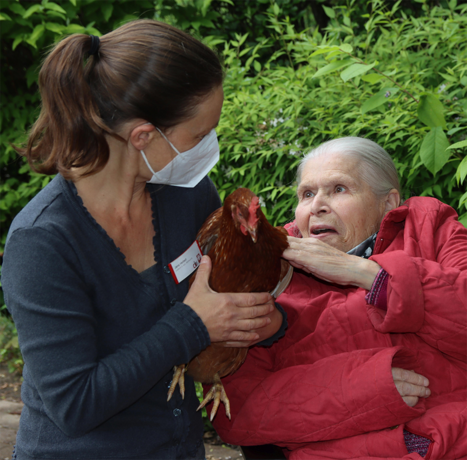 Berührungsängste haben die Tiere jedenfalls keine. Bewohnerin Gretchen Wüst auch nicht. Zart streichelt die Seniorin einer Henne über den Kopf. „Solche haben wir früher auch gehabt“, erzählt sie. Rita Hinderberger sieht interessiert zu, aber so ganz traut sie dem Federvieh dann doch nicht. Wenig später gesellt sich auch noch Eva-Maria Holzinger zu den beiden. Die Musiktherapeutin ist zu Besuch im Altenzentrum und lässt es sich vor der Gruppenstunde nicht nehmen, mit den beiden Bewohnerinnen im Garten spontan noch „Ich wollt, ich wär ein Huhn“ zu singen. Weil es gar nicht so viele Lieder mit Hühnern gibt, wird sie kreativ und stimmt sie noch ein „Fuchs, du hast das Huhn gestohlen“ an.