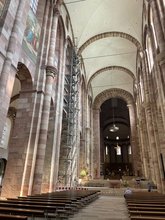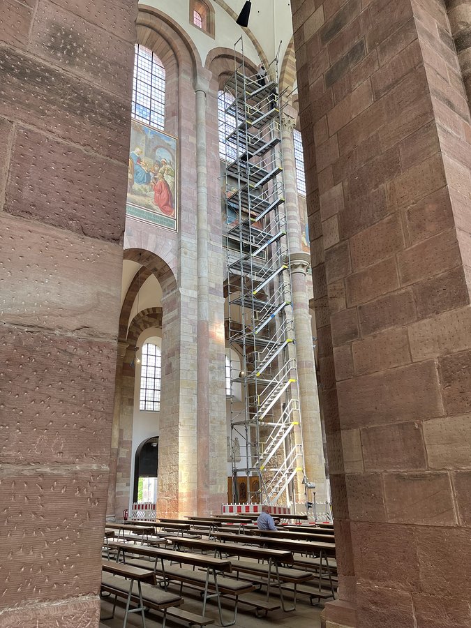 Speyer. Die Nordseite des Doms und das Dominnere haben in diesen Tagen ein weiteres Gerüst erhalten. Das Gerüst im Innern steht im vierten Joch des Langhauses. Es dient der Voruntersuchung der Fresken durch eine Restauratorin bei denen bei einer Befahrung mittels eines Hubsteigers bereits Schäden festgestellt wurden. Die Voruntersuchung und kleinen Musterflächen dienen der Entwicklung eines Restaurierungskonzeptes, welches auf alle Fresken Anwendung finden wird.
