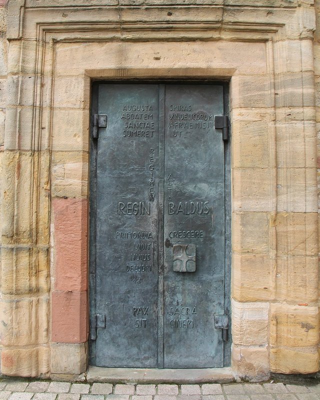 Augusta Spiras abbatem Vindelicorum Sanctae Afrae misit, sumeret ut regimen: Reginbaldus alta primordia crescere vidit Huius delubri. - Pax sacra sit cineri! | Augsburg schickte den Abt von Sankt Afra nach Speyer, damit er das Bistum regiere: Reginbald war es, er sah diesen Dom in seinen Anfängen emporwachsen. - Seine Asche ruhe in heiligem Frieden. |