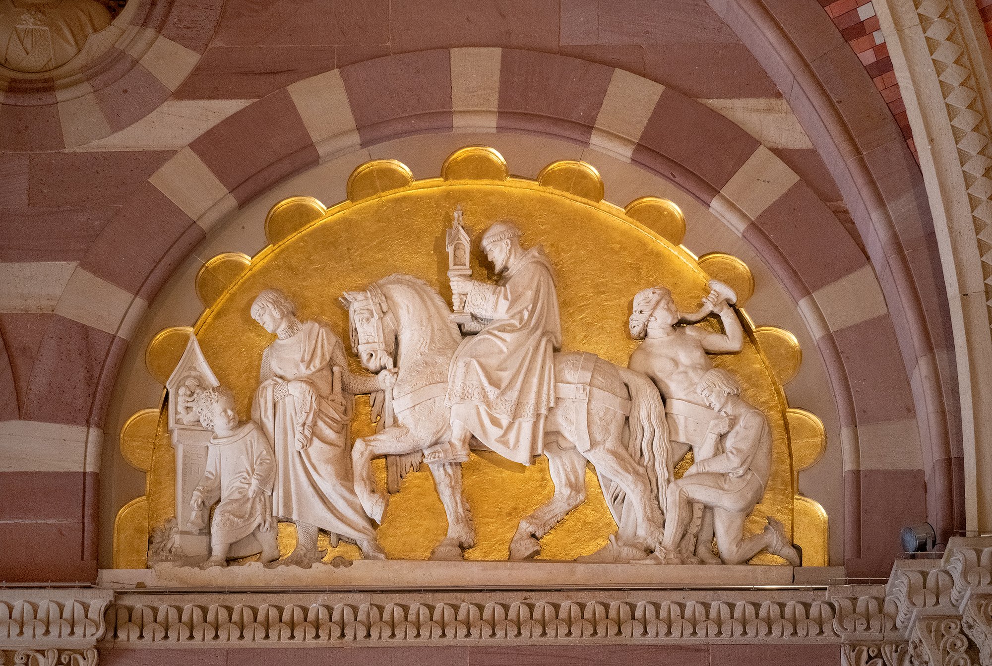 Rudolf von Habsburg, geboren am 1. Mai 1218, kam erst im Alter von 55 Jahren in Regierungsposition. Ein schnell voranschreitendes Gichtleiden schmälerte seine körperlichen Kräfte. Der Legende nach saß er in im nahen Germersheim beim Brettspiel als ihm die Ärzte seinen nahen Tod verkündeten. Der Legende nach soll er geantwortet haben: „Nun wohl, dann nach Speyer wo mehrere meiner Vorgänger liegen. Damit niemand mich hinzuführen braucht, will ich selbst zu ihnen reiten.“ Dieser letzte Ritt, wie er gebeugt auf seinem Pferd sitzt, ist auf einem Relief an der Innenseite des Dom-Hauptportales zu sehen. Es befindet sich ganz rechts in der Reihe über dem Portal. 1964 schrieb das Bischöfliche Bauamt einen Wettbewerb für die Gestaltung des Hauptportals aus. Den Auftrag erhielt der Salzburger Toni Schneider-Manzell.