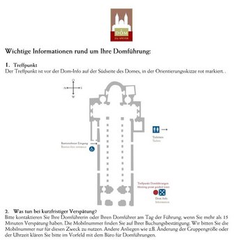 Die Standardführung zeigt der Dom von Außen und Innen, inklusive Krypta und Grablege. Die "Große Domführung" beinhaltet auch den über der Vorhalle gelegenen Kaisersaal und bietet die Möglichkeit zur Turmbesteigung.